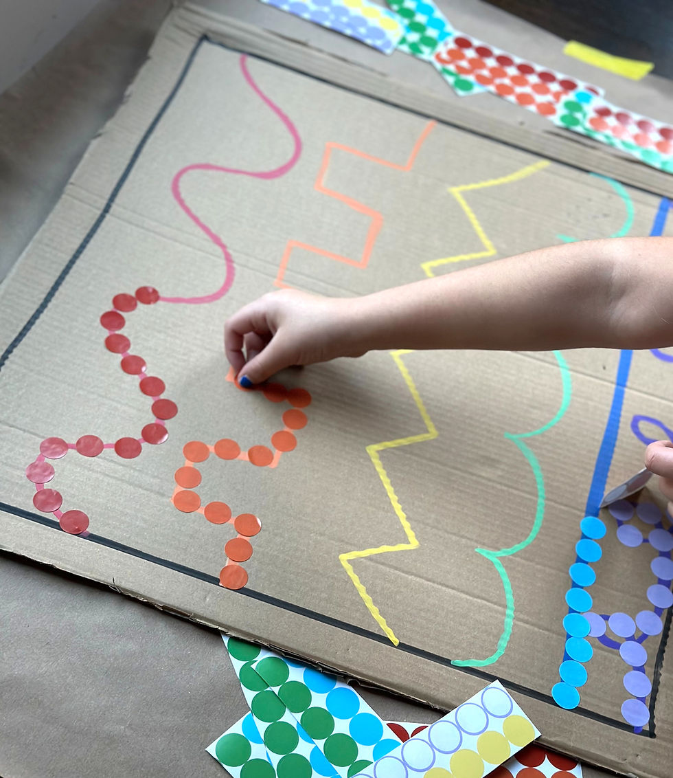 Our first activity focused on one of the most important early fine motor skills: the pincer grasp. Stickers are a toddler favorite, and peeling them off the sheet requires precision, finger strength, and hand‑eye coordination.