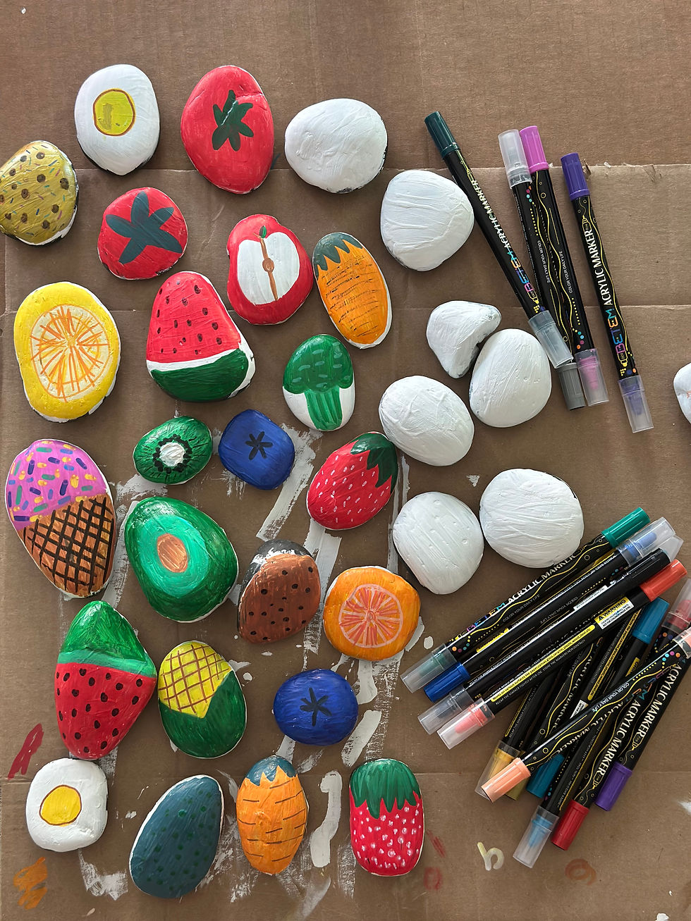 Step 4: Use acrylic paint markers to draw fruits or foods (apples, strawberries, lemons, watermelon, etc.)